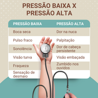 👉🏼 Já a pressão baixa, ou hipotensão, acontece se os níveis estiverem abaixo de 90/60 mmHg, podendo causar sintomas como tontura e fraqueza, e às vezes até mesmo desmaios.
